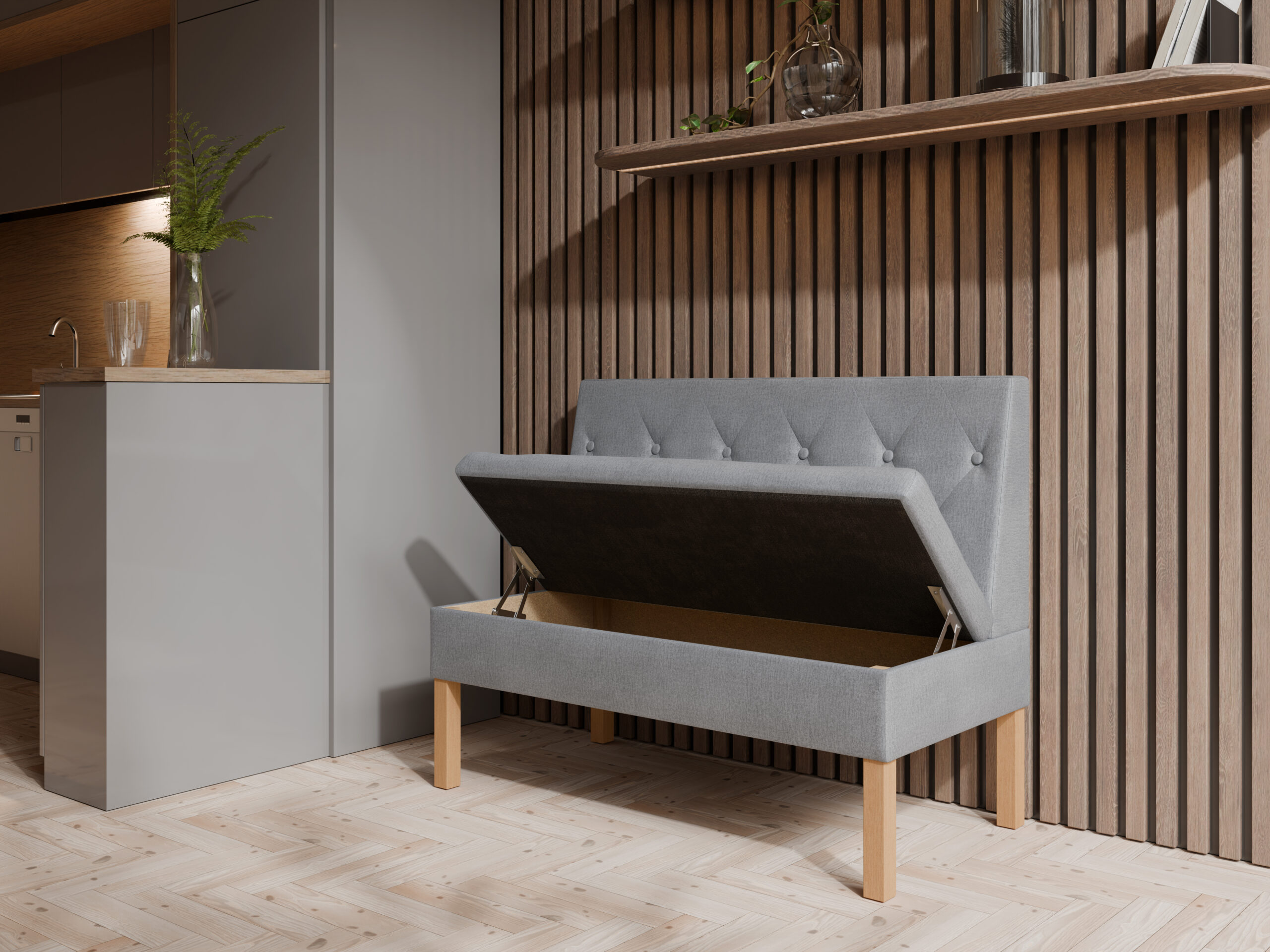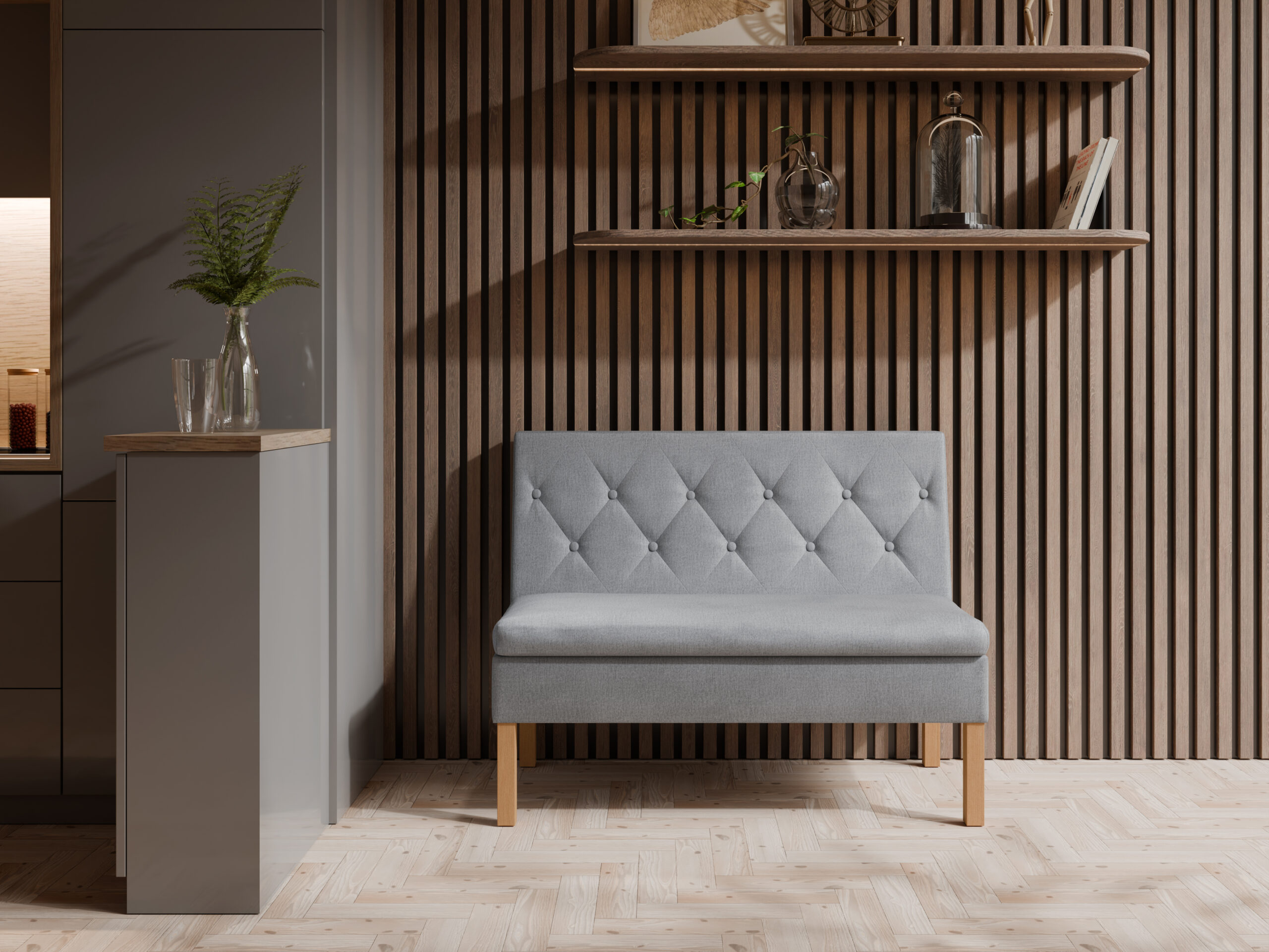 - 🔄 Mebel wolno stojący – tył ławki jest obity tkaniną, dzięki czemu prezentuje się estetycznie z każdej strony.